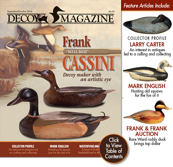 (ON THE COVER): For years, Upstate New York collectors have been trying to establish the identity of an unknown decoy maker whose decoys closely resembled the work of Sam Denny of Clayton, NY - hence the nickname “Pseudo Denny.” It turns out that Denny wasn’t the only St. Lawrence River area decoy maker whose birds he emulated. We unravel the mystery with our cover story beginning on page 32. Not a subscriber?Read this fascinating story by ordering the March/April 2016 issue or subscribe nowto Decoy Magazine.
