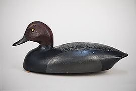 Bluebill by an unidentified maker from Ontario, Canada. Flat-bottomed, solid-bodied decoy with nicely applied combed-painted tail feathers. Bulbous head gives it an animated folky look. While the maker is unknown, it appears to be from the Toronto area. $1095 |